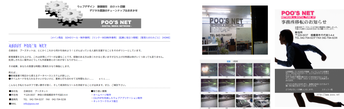 | 沿 革 | ■2001年11月 それまで勤務していた会社が倒産し、思い立ったように神奈川県相模原市中央区上溝(自宅)にて法人登記を行う。 社名は失業者の俗称「ぷー太郎」をもじり、プーズネットとする。 その後、プーという発音が英語では幼児の「うんち」という意味と知り後悔する。 ■2001年12月 なぜか決算期を12月としたため、あっという間に第1期の決算を迎える。消費税免除の特別期間を1期失う。 純粋な失敗であったと後悔する。 ■2002年1月 ボウリング場ディスプレイを利用した広告事業開始 ■2004年1月 上記広告制作の技術を活かしホームページ制作(WEBページ制作)事業を開始 ■2004年11月 都内の某IT会社よりヘッドハンティングを受け、会社を運営しながらという条件で入社。 様々な刺激を受けながら基本的なサイトの構築・展開方法を学び、この会社ではプロバイダを立ち上げた。 ■2007年4月 徐々にプーズネットの事業が拡大しIT会社との両立が難しくなり退社。 神奈川県相模原市中央区千代田3丁目に事務所を構える。 ■2007年11月 DTP関係の社員を1名迎え、印刷会社と提携し本格的にDTP(印刷)業務を開始。 ■2008年1月 ネットワークカメラASPシステムを開発、レンタルを開始する。 ■2008年7月 タイムカードASPシステム開発、レンタルを開始する。 ■2009年2月 WEBページ用オリジナルCMS開発、ホームページの量産を可能とする。 ■2011年3月 環境省インターネット自然研究所向けのネットワークカメラ設置工事及び画像ライブラリサーバー、 公開WEBページリニューアル業務を入札により受注。 ■2012年5月 インテリジェンスネットワークカメラシステムの開発を開始。 (現地映像+データロガーより各種データ取得~サーバー蓄積) ■2014年12月 ネットワークカメラ+クラウドサービスシステムを(株)吉田東光様と共同開発を行い、レンタル事業を開始する。 ■2016年8月 業務拡張のため神奈川県相模原市中央区相生1丁目の事務所に移転。 ■2020年1月 業務拡張のため神奈川県相模原市中央区相生4-5-1に移転 ■2024年6月 合資会社から株式会社へ組織変更 |