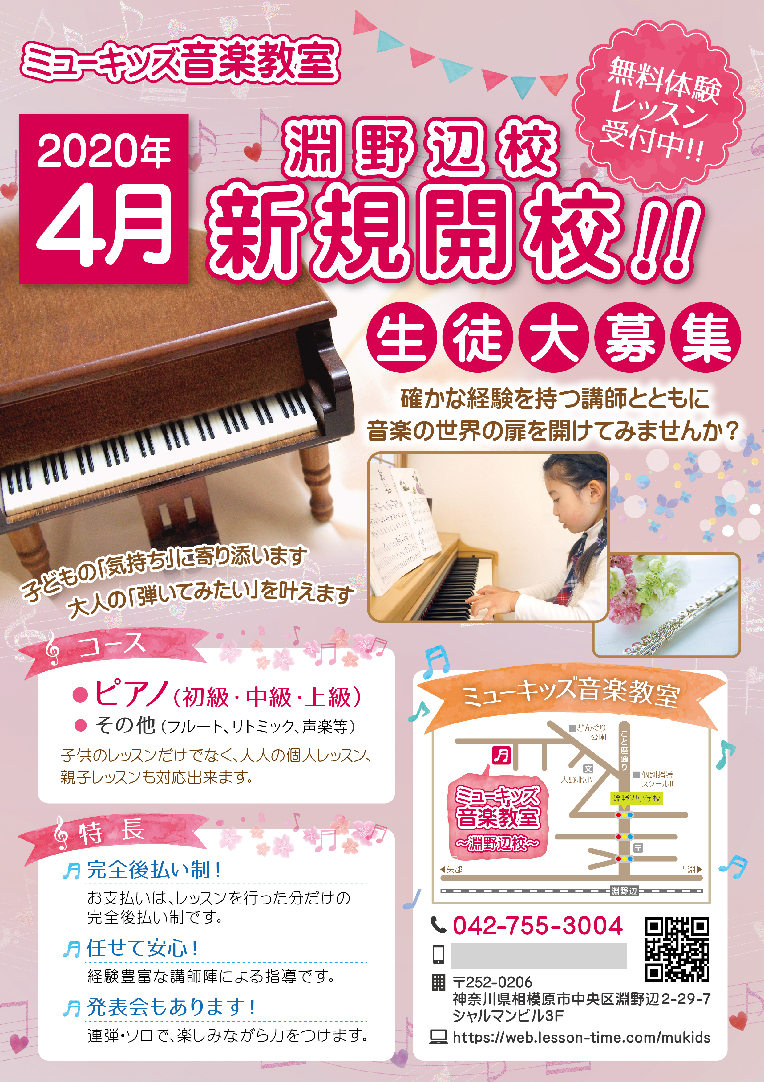 株式会社ミューキッズ様より、ミューキッズ音楽教室 新規開校のA4チラシ制作のご依頼をいただきました。